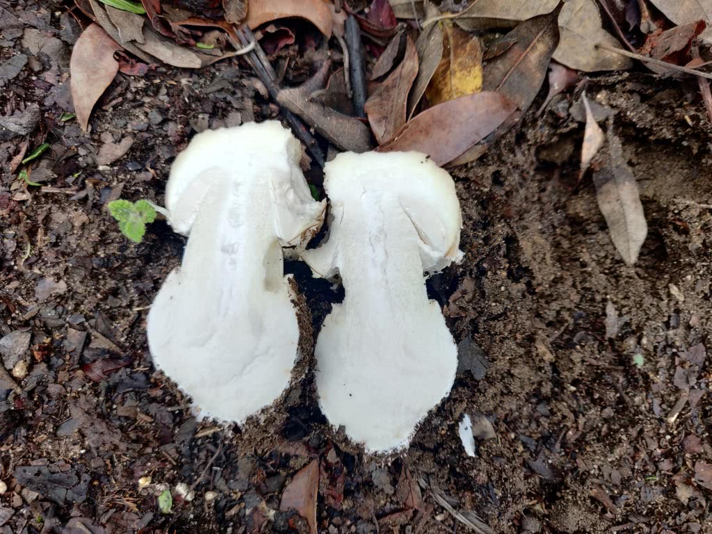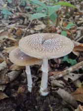 Présente des fragments de voile gris sur son chapeau. La tige de la plupart des spécimens est robuste et la base ne présente pas de gouttière volvaire distincte.