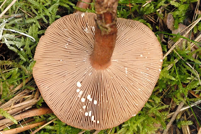 Attaché à la tige ou commençant à s'écouler le long de celle-ci ; serré ; non rarement fourchu près de la tige ; blanchâtre au début, devenant jaunâtre sale au fur et à mesure que les spores mûrissent, mais ne présentant pas de taches ou de colorations.