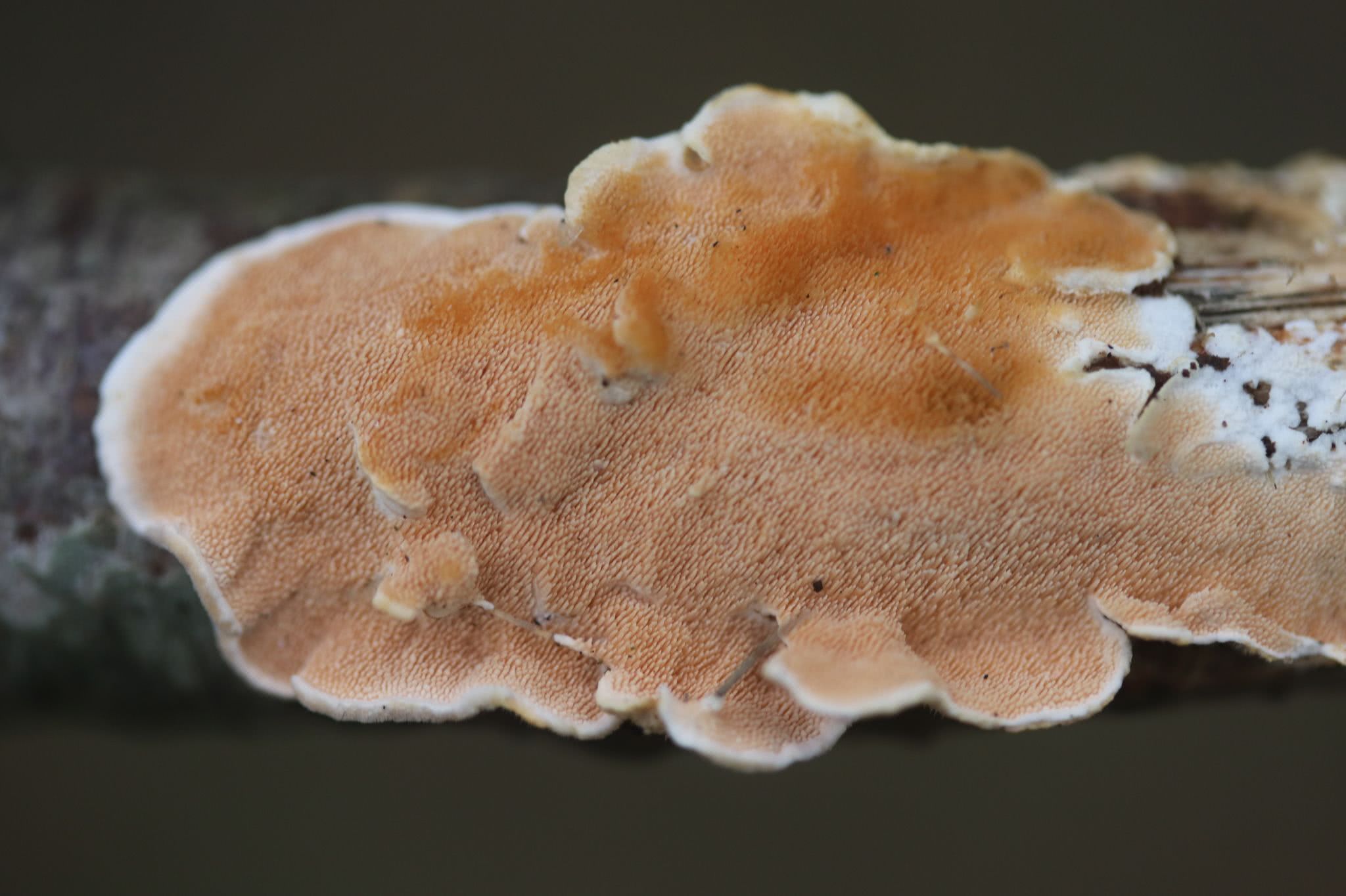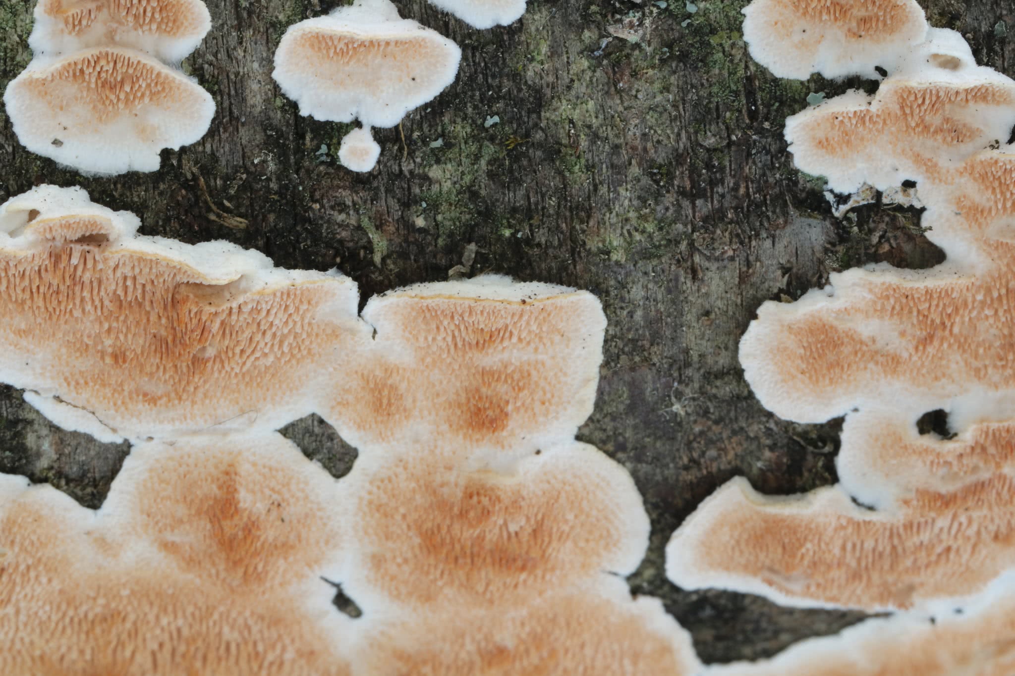 Les chapeaux de ce champignon, de couleur jaune orangé ou ocre, ont une marge blanchâtre. Les chapeaux sont souvent poilus, zonés et peuvent se présenter en grappes qui se chevauchent. Les surfaces inférieures des chapeaux et les parties croustillantes résupinées sont couvertes d'épines de couleur ocre pouvant aller jusqu'à 1 mm de long.5 mm de long et souvent fourchus à leur extrémité.