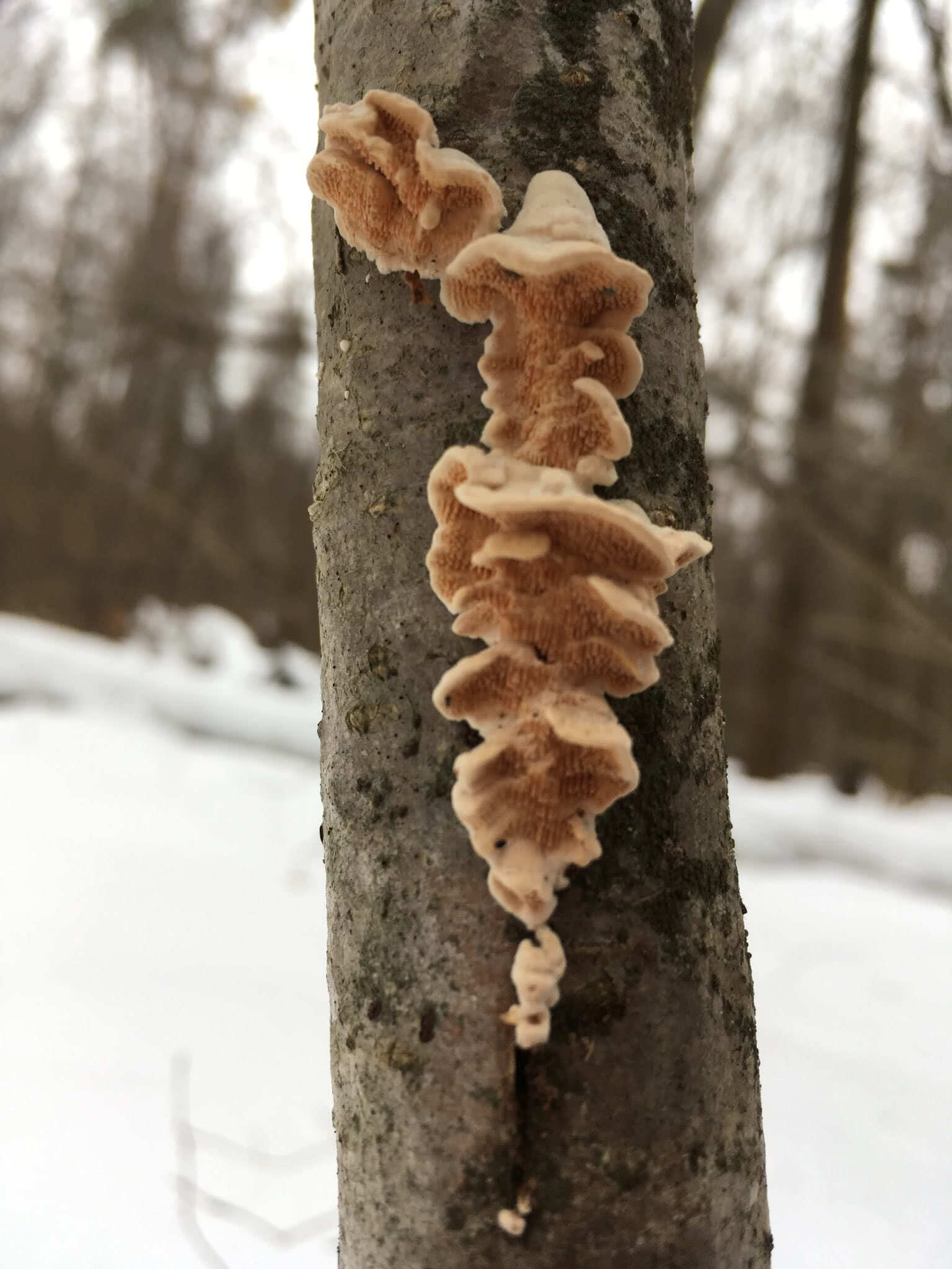 Variable ; généralement une plaque d'épines denses jusqu'à environ 3 cm de diamètre, avec des bords repliés (surtout lorsqu'elles poussent sur des troncs et des bâtons) - mais parfois avec un chapeau bien défini et même, parfois, une tige (surtout lorsqu'elles poussent sur des souches).
