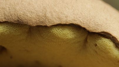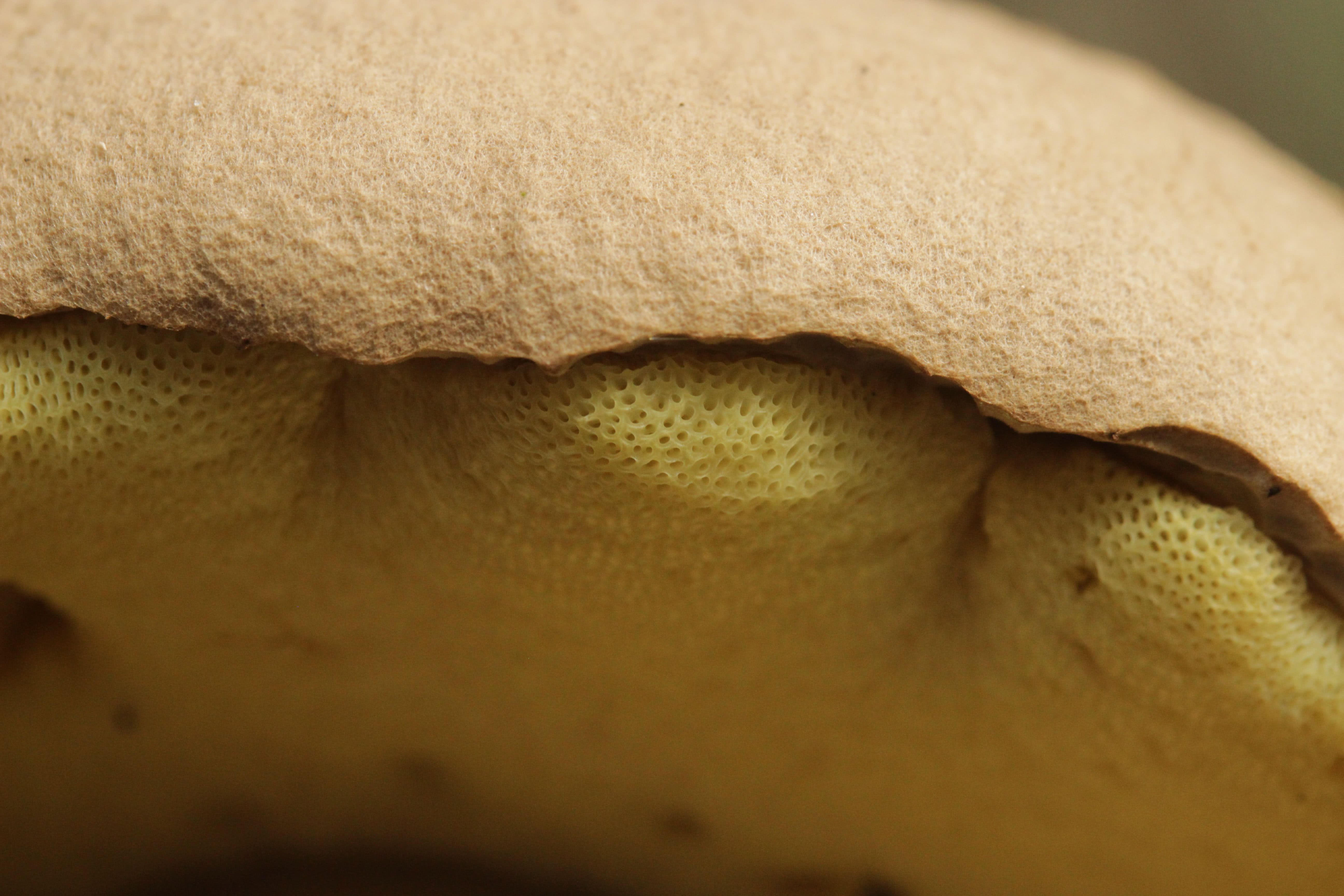 Les tubes jaunes de la bolete du hêtre amer se terminent par de minuscules pores jaunes qui deviennent bleu-vert lorsqu'ils sont coupés ou meurtris. (De petites zones de bleuissement sont visibles sur la photo de gauche en gros plan).)