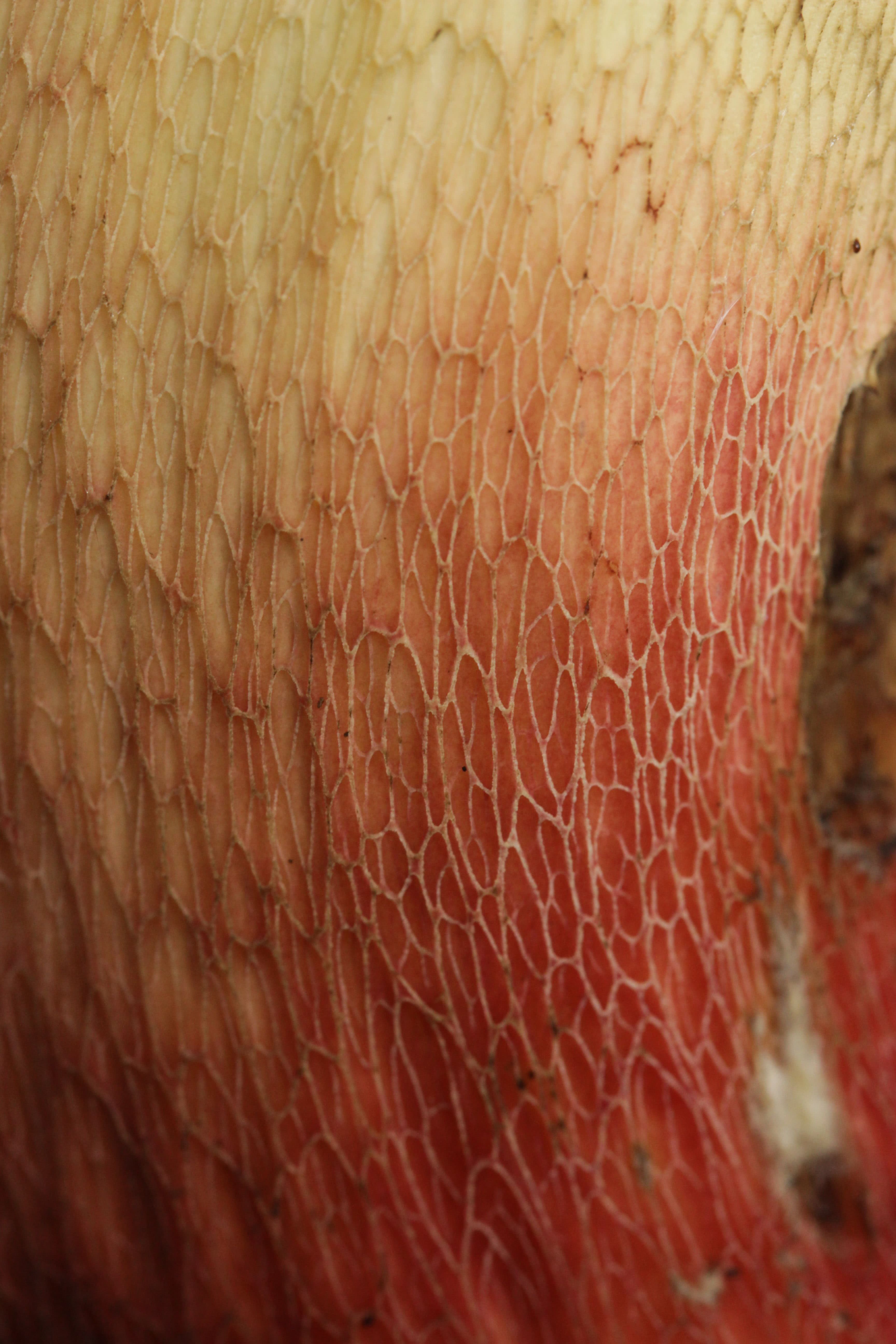 7 à 9 cm de haut et 3 à 5 cm de diamètre ; souvent courbée à la base ; jaune citron à l'apex et rouge vif en dessous, devenant d'un rouge plus profond à maturité ; couverte d'un réseau jaunâtre pâle (gauche). Par tous les temps, sauf les plus secs, il n'est pas rare de trouver des morceaux de tige manquants bien avant qu'un corps fructifère ne se soit complètement développé et n'ait pris son aspect rougissant.