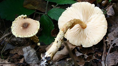 Libérée de la tige ; proche ; présence de branchies courtes ; blanche, devenant légèrement brunâtre avec l'âge ; d'abord recouverte d'un voile partiel fin et blanc.