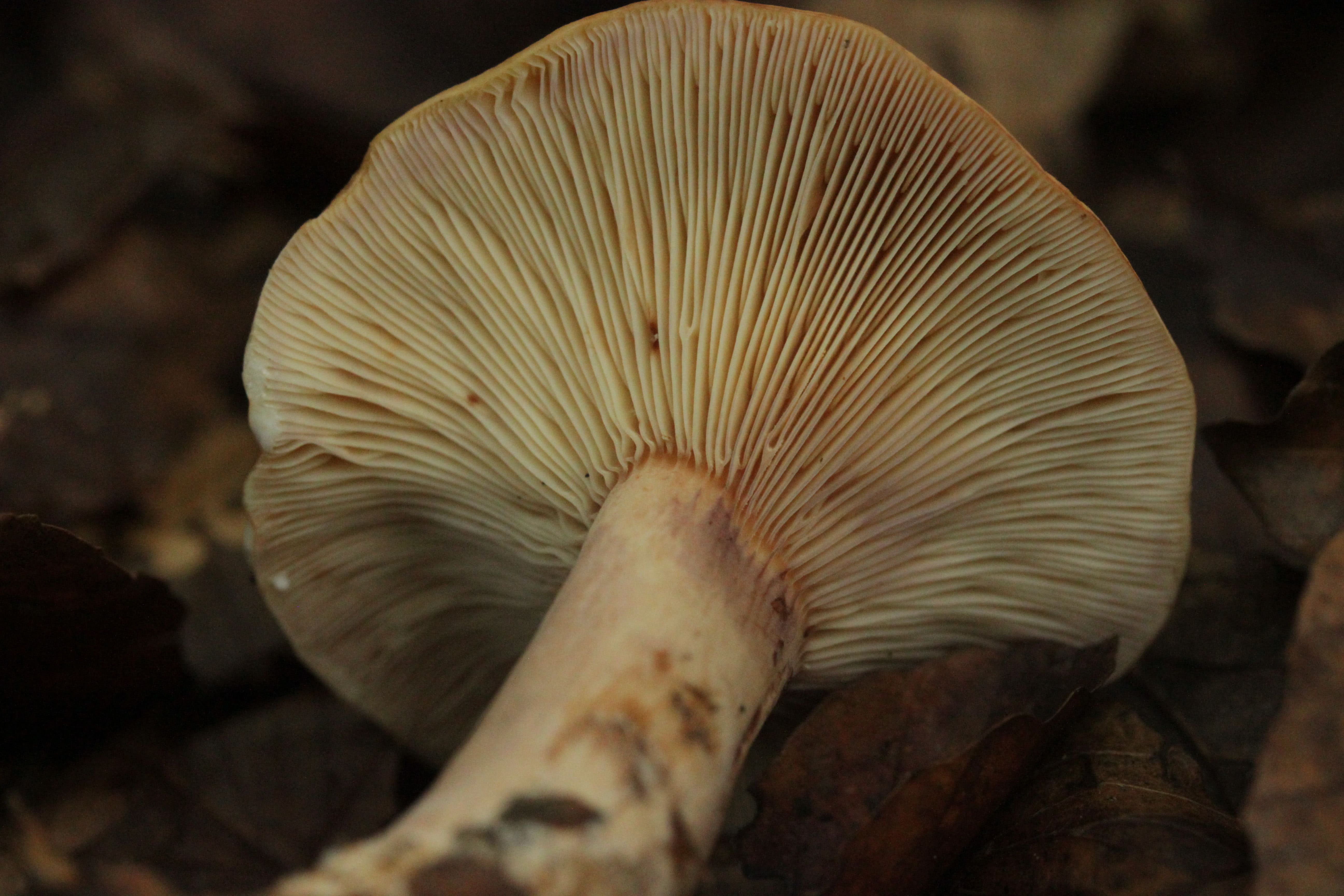 Couleur bleu rosé pâle ; adnées (parfois avec une légère dent près du point d'attache) ou légèrement décurrentes ; modérément serrées, certaines étant fourchues ; lorsqu'elles sont coupées, elles libèrent un latex aqueux blanchâtre qui ne change pas.