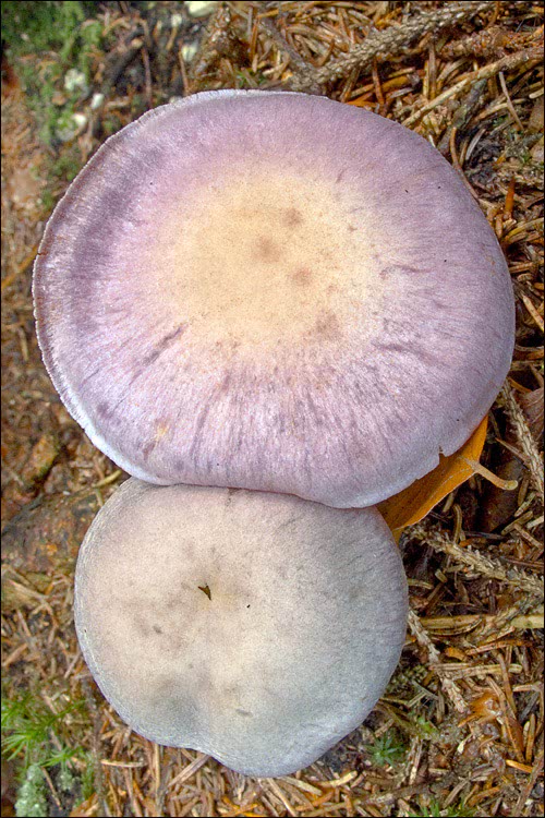 D'une couleur lilas plus profonde, les branchies sont ocre pâle lorsqu'elles sont jeunes, et la chair de la tige développe des taches rougeâtres.