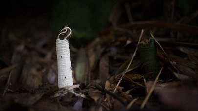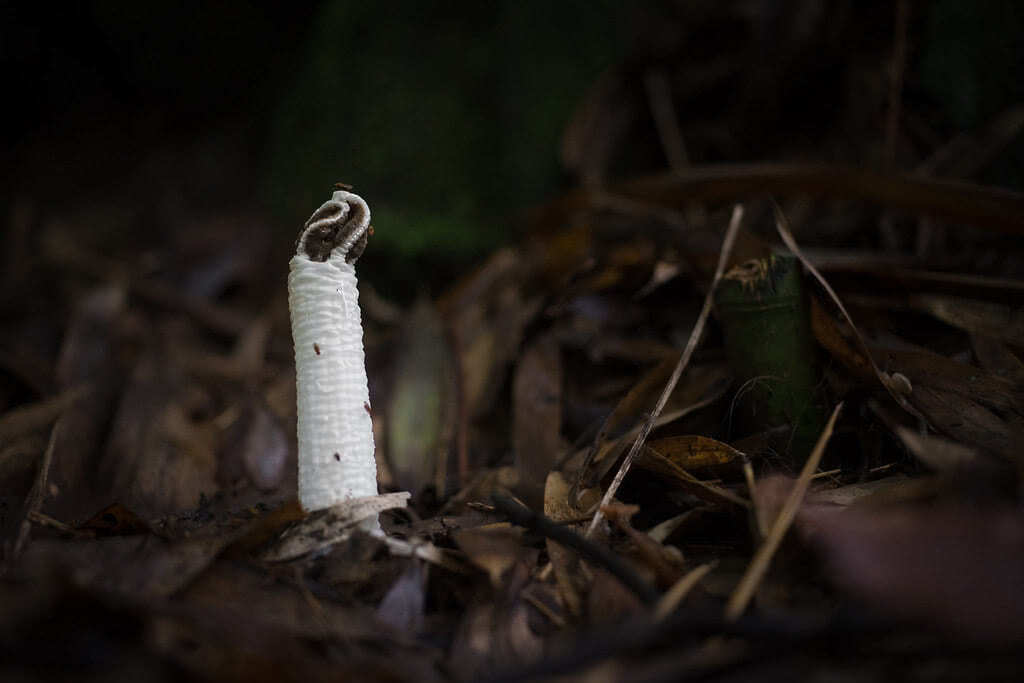 Blanc, jusqu'à 30 mm de diamètre, avec des rhizomorphes blancs à la base. Les restes de l'œuf sont vus comme une volve à la base de la tige du corps fructifère mature.