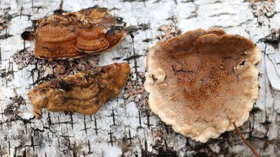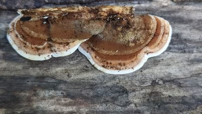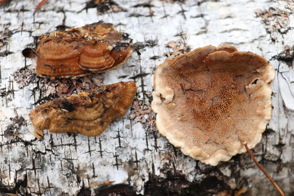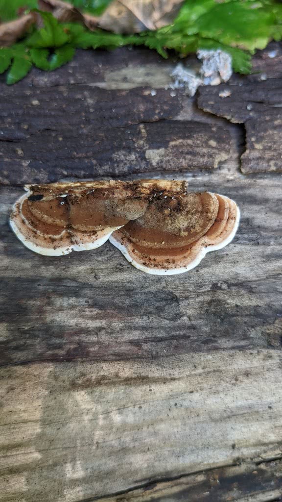 En forme de capuchon, ils adhèrent fermement au substrat sans stipe et mesurent de 5 à 14 cm (2.0-5.5 in) sur 10-50 cm (4-20 in) sur 1-5 mm d'épaisseur. Ils ont une texture de cuir lorsqu'ils sont frais, mais deviennent fragiles lorsqu'ils sont secs. La surface du chapeau est d'abord tomenteuse, puis devient lisse et zonée avec une surface irrégulière et une couleur brun cannelle.