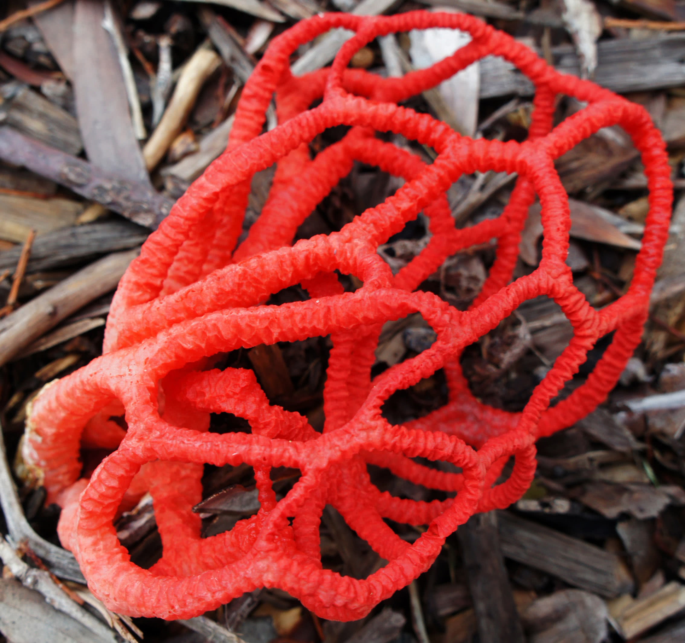 Initialement, un "œuf" blanchâtre de 2 cm de diamètre, attaché à des cordons blancs ; en se rompant, le stinkhorn émerge sous la forme d'une structure en forme de cage, de 5 à 8 cm de haut, composée d'environ 10 bras ondulés, écarlates, de section transversale grossièrement triangulaire, qui fusionnent en une base en forme de tige et légèrement plus pâle, composée de colonnes verticales ; les surfaces intérieures de la cage sont couvertes d'une bave brun olive malodorante ; le tissu de l'œuf crée une volve blanchâtre.