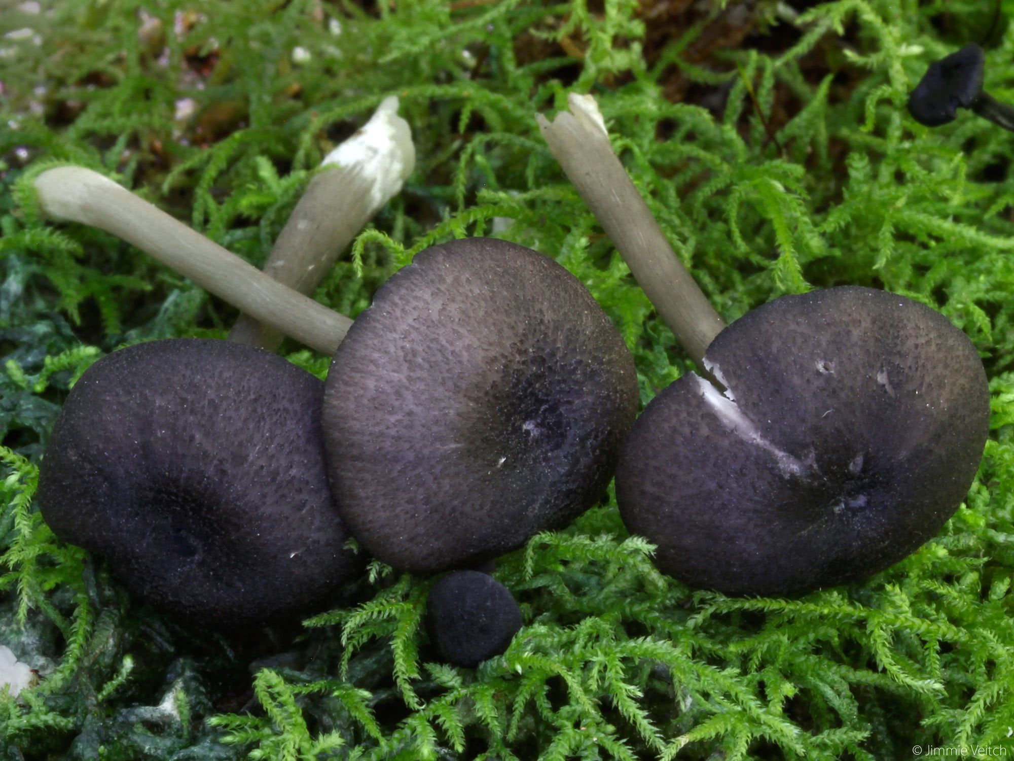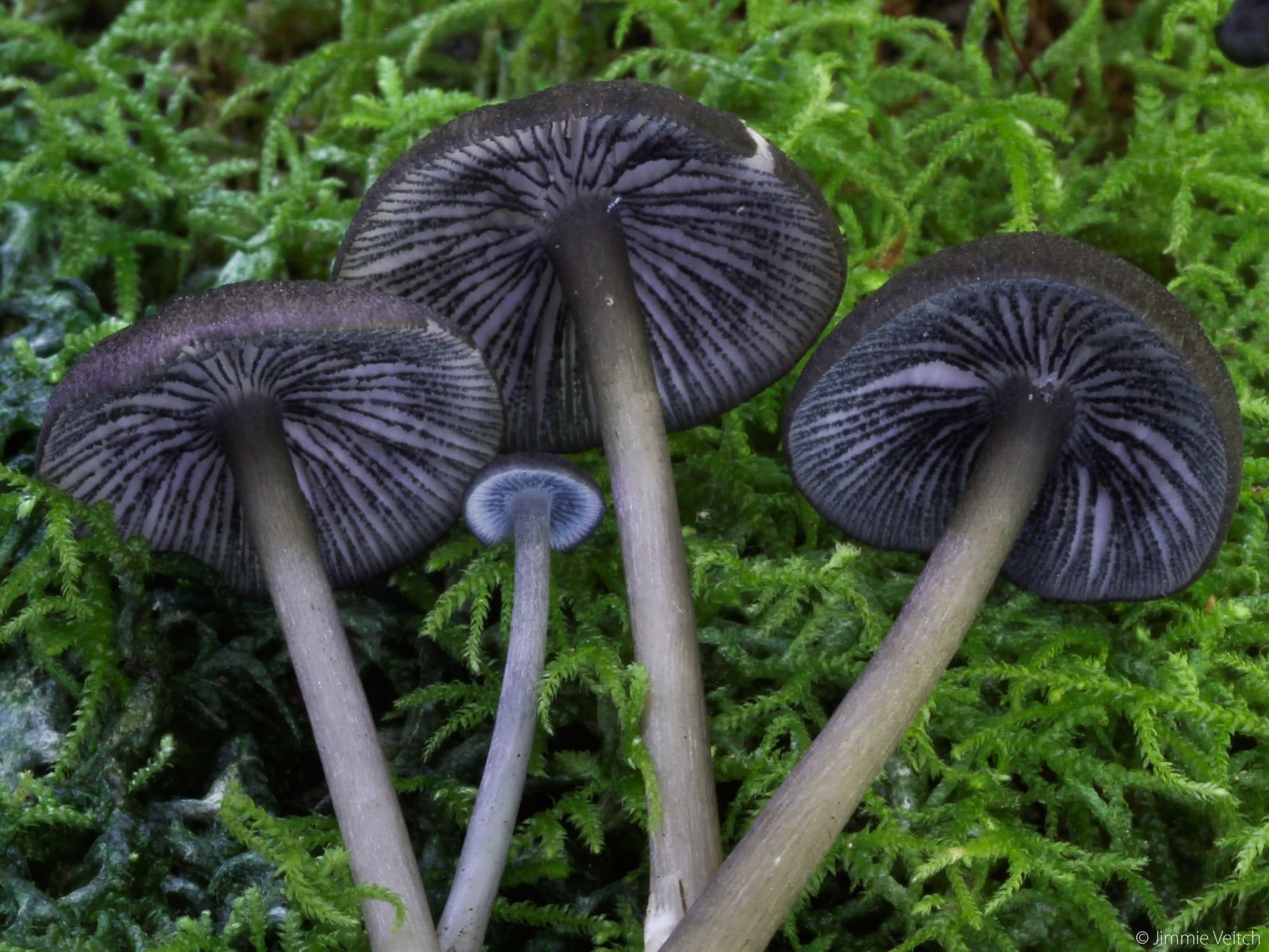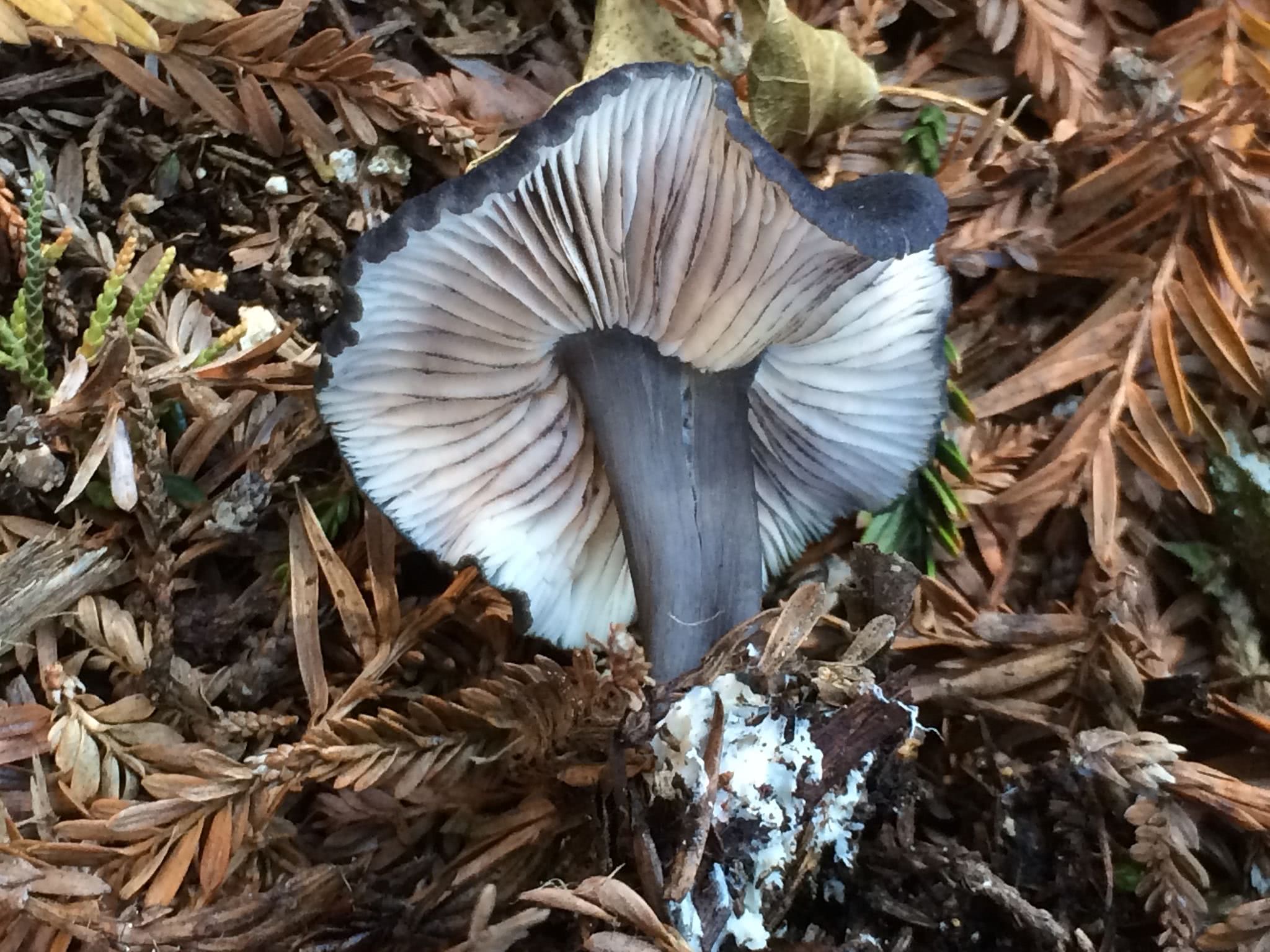 Attachée à la tige ; serrée ; blanchâtre ou gris bleuâtre pâle au début, devenant rosâtre ; avec des bords noirs ou noirs bleuâtres ; dentelée ; avec des branchies courtes fréquentes.