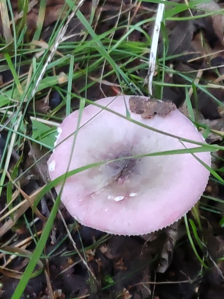 2 à 5 cm de diamètre, les capuchons fragiles s'aplatissent rapidement et présentent souvent un centre légèrement déprimé, mais au détail une marge renversée. Le chapeau soyeux et lisse est légèrement visqueux lorsqu'il est mouillé ; sa cuticule se détache jusqu'à une distance comprise entre 1/2 et 3/4 du centre. Les spécimens matures développent souvent une marge sillonnée et quelque peu bosselée. (Le terme technique pour une marge sillonnée est "sulcate").) La couleur du chapeau varie du violet pâle au rose saumon en passant par le rose ou la couleur chair, avec des teintes verdâtres ou olivâtres pâles (parfois gris foncé) dans la région centrale. Comme c'est le cas pour beaucoup de russules rougeâtres, une grande partie de la couleur du chapeau peut être emportée par un temps humide prolongé.