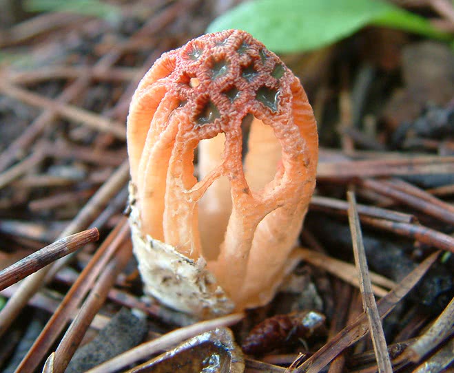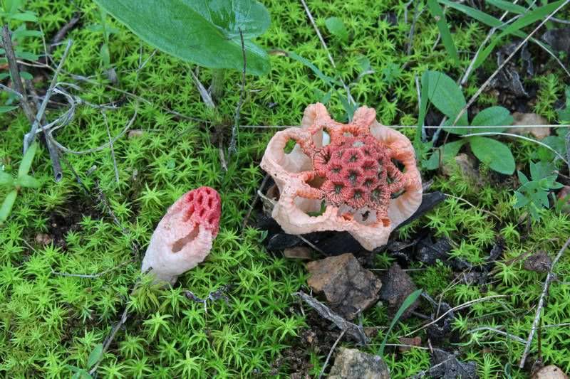 Commencent leur développement sous la forme d'une structure en forme d'œuf. Mesurant environ 1 cm (0.4 in) de diamètre, l'œuf à peu près sphérique est blanc ou tacheté de brun sur la partie supérieure. Un ou plusieurs rhizomorphes blancs et fins sont attachés en dessous. Après avoir émergé de l'œuf, le corps du fruit est constitué d'un pédoncule court et épais d'où partent entre quatre et six colonnes verticales et arquées. Ces colonnes, colorées en rose en dessous et dont la couleur devient progressivement rouge près du sommet, ont une texture de surface ondulée. Les colonnes se divisent souvent près du sommet en branches supplémentaires qui soutiennent un dôme en forme de treillis ou de clathrate. Les mailles du filet fertile sont grossièrement polyédriques et il y a une transition abrupte entre les colonnes et le treillis.