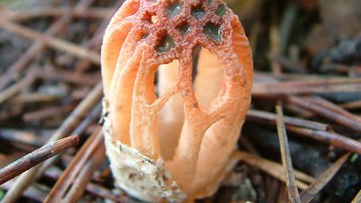 Les bras rougeâtres jaillissent d'un œuf gélatineux pour former un panier, comme une écrevisse. Les bras, attachés à une tige, se divisent au sommet et se relient entre eux pour créer des mailles. Ces derniers portent la masse de spores brunes, visqueuses et nauséabondes, qui attirent les mouches pour disperser les spores.
