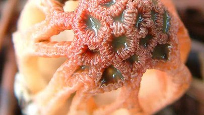 Un autre bigorneau présentant une structure clathrate, mais à la différence de Colus hirudinosus, C. ruber a des trous plus grands et le treillis s'étend jusqu'à la base de la structure fructifère.