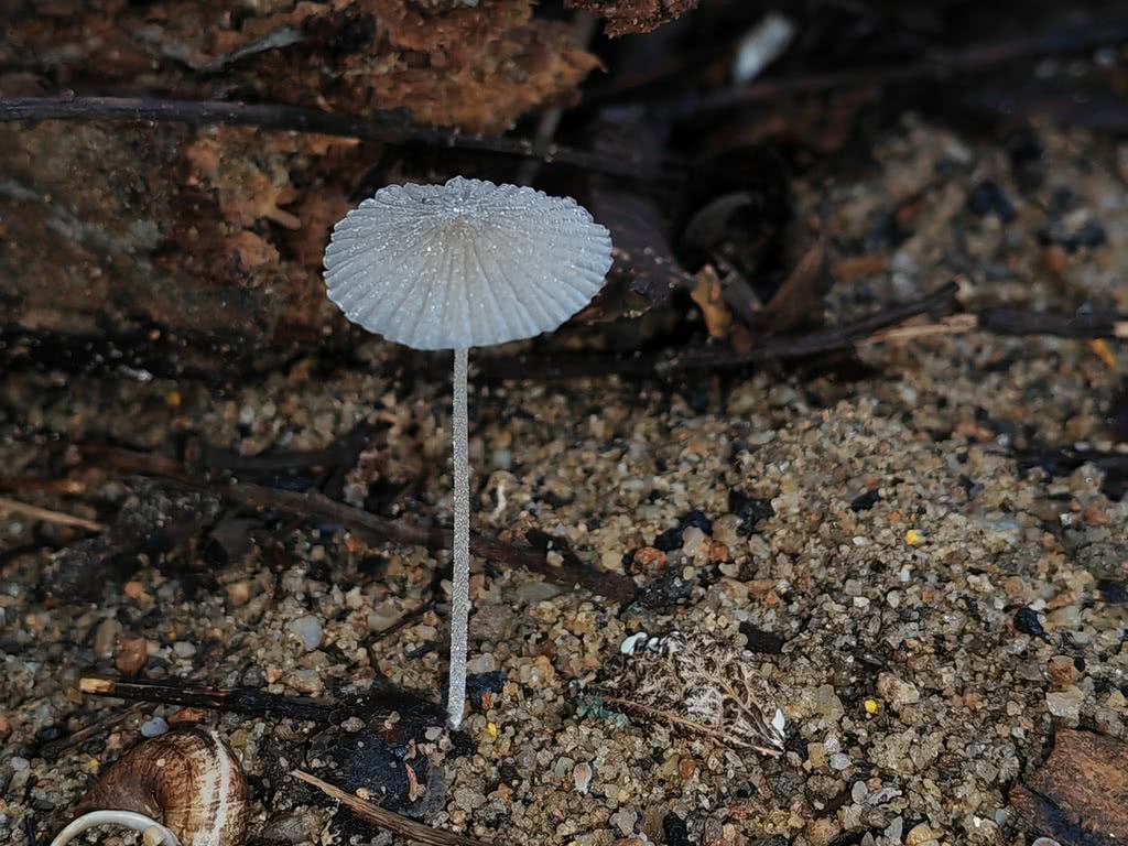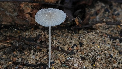 10-40 mm ; conico-convexe à plan-convexe lorsqu'elle est étendue ; cannelée presque jusqu'au centre ; brunâtre lorsqu'elle est au stade de bouton, mais bientôt grise dans l'ensemble, avec un centre brunâtre ; très finement mouchetée de matière voilée blanchâtre (utiliser une lentille manuelle), du moins lorsqu'elle est jeune ; la marge devient en lambeaux au fur et à mesure que les branchies se dissolvent.