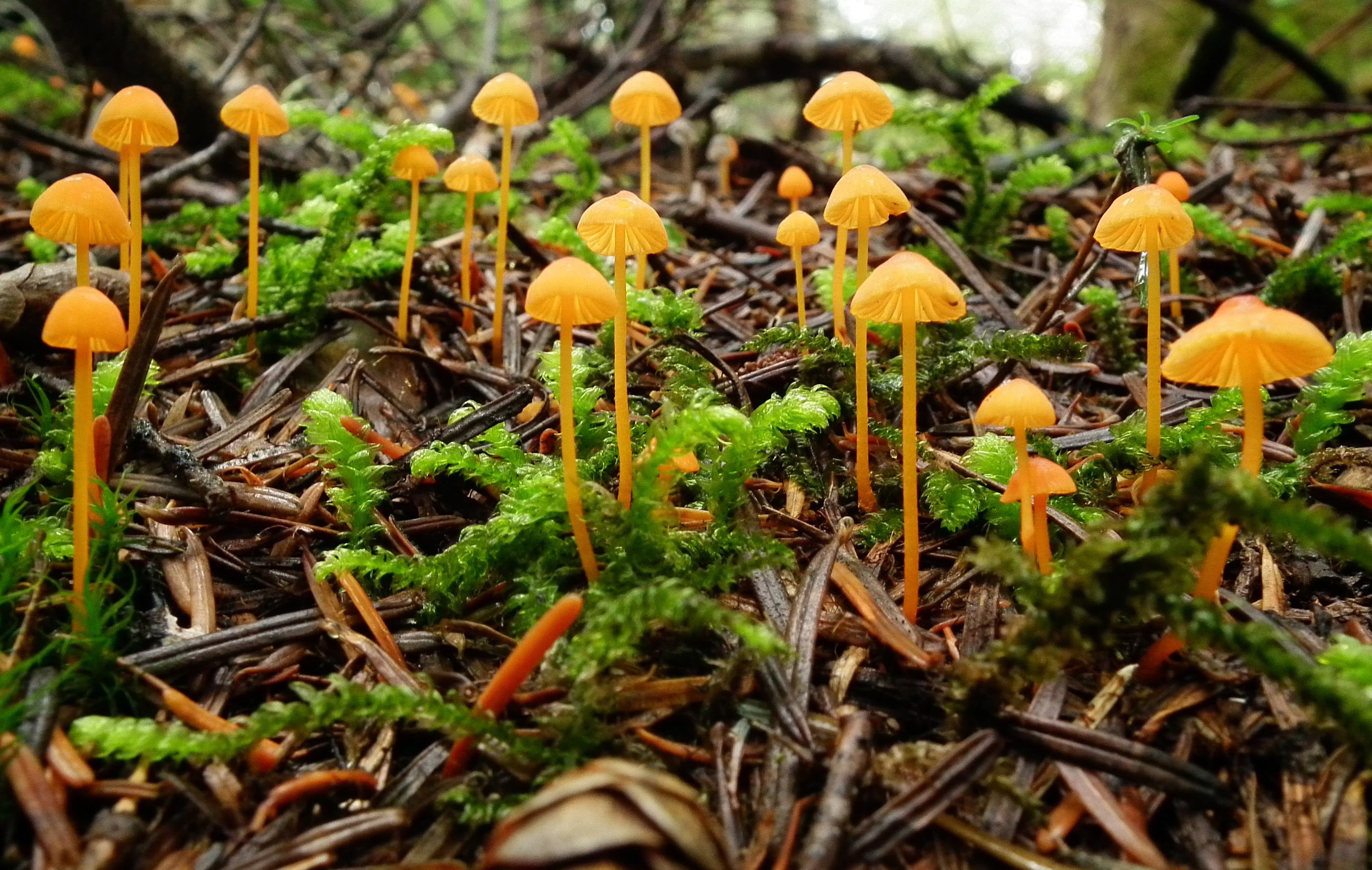 Mycena strobilinoides se distingue par son chapeau orange brillant et son stipe avec des branchies marginées orange. Elle est moins fréquente ailleurs dans le nord de l'Amérique du Nord et également en Europe. M. strobilinoides semble être plus commun à des altitudes moyennes dans les montagnes, souvent en association avec des pins. Pousse de manière dispersée à grégaire sur les aiguilles de conifères ; peu commun dans les chaînes Klamath et Cascade du nord de la Californie.