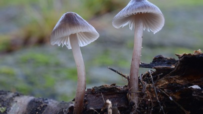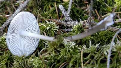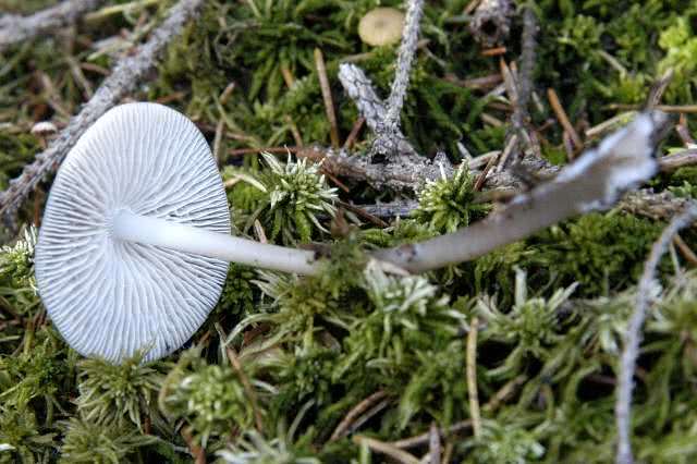 2-9 cm de long, 1.5-4.0 mm d'épaisseur, droite à courbée à la base, égale, quelque peu aplatie en section transversale, cartilagineuse, creuse à bourrée à maturité ; la surface de l'apex glabre, lustrée, blafarde, la partie inférieure gris-brun, indistinctement striée à striée-torsadée, parfois tachetée de brun rougeâtre, une couverture dense de poils blanchâtres à la base, ces derniers bien développés, poussant dans le substrat, n'exsudant pas un suc rougeâtre ; voile partiel absent.