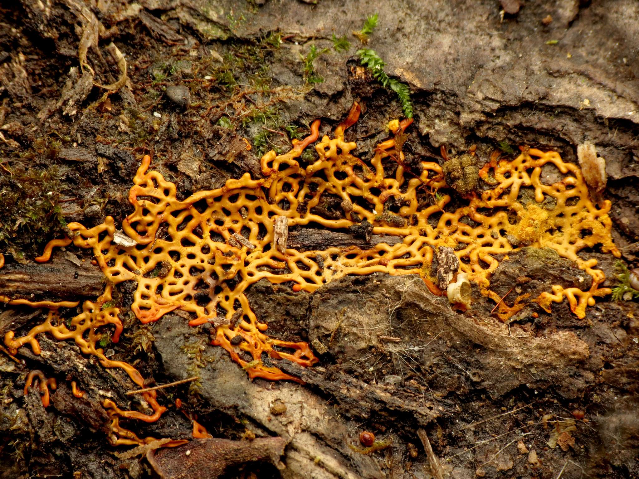 À maturité, le fruit se présente sous la forme d'un réseau de veines ou de brins jaune vif à jaune moutarde, ressemblant à un bretzel. Les parois extérieures se désagrègent, révélant une masse de spores cotonneuses de couleur jaune moutarde.